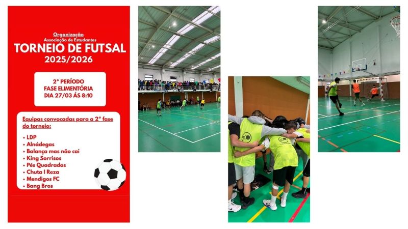 A Associação de Estudantes convida toda a comunidade escolar a estar presente no pavilhão desportivo da escola, no dia 27 de março, último dia de aulas do 2.º período, para assistir à segunda fase do Torneio de Futsal do ano letivo 2025/2026.