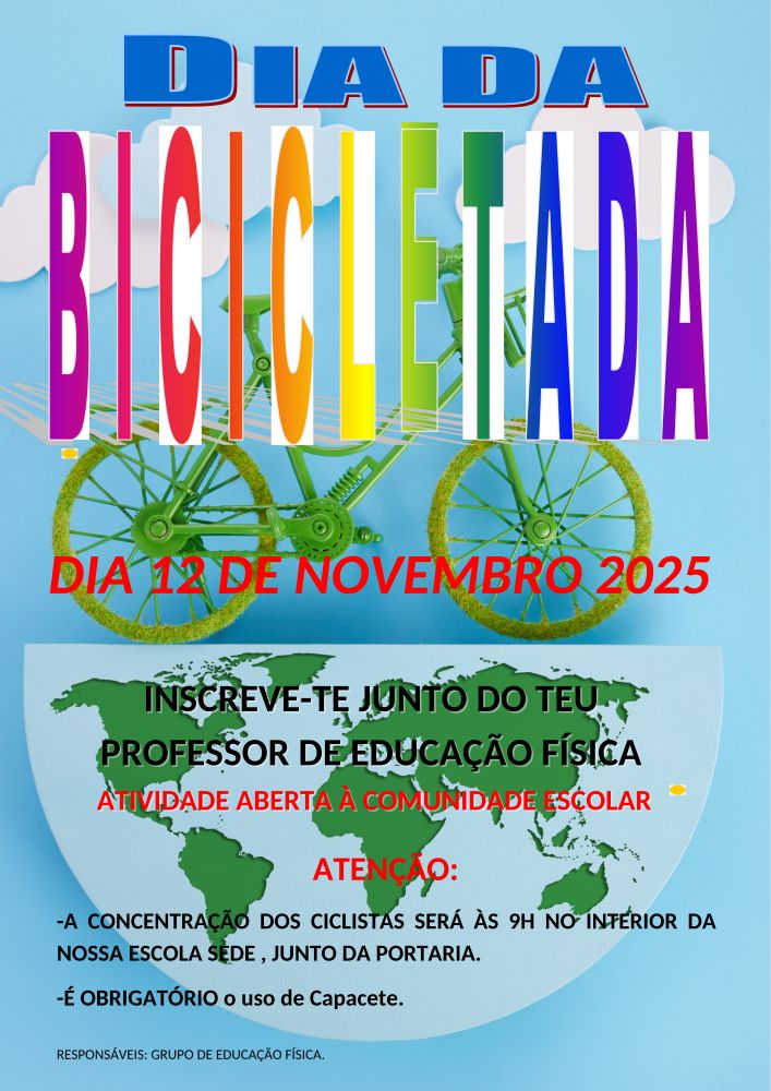 Conforme previsto no Plano Anual de Atividades do AEDAS, o grupo de Educação Física vai realizar, no próximo dia 12 de novembro, a atividade “BICICLETADA”, que decorrerá, previsivelmente, entre as 9h00 e as 12h00.