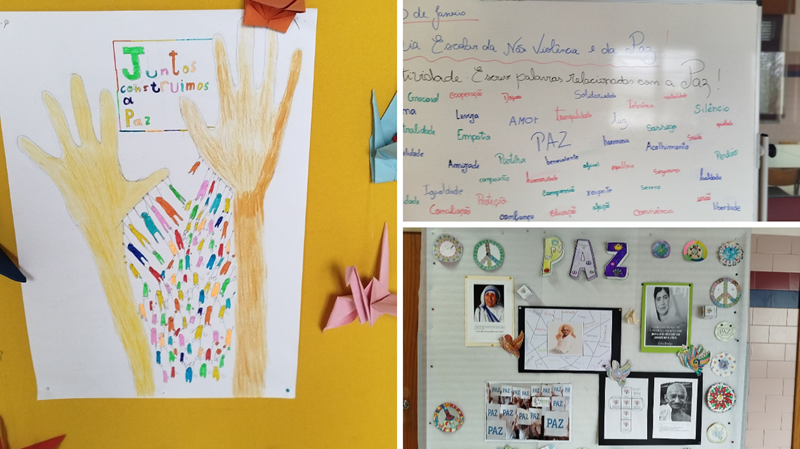 No âmbito da disciplina de EMRC (Educação Moral e Religiosa Católica), assinalou-se, no dia 30 de janeiro, o Dia da Não Violência Escolar e da Paz. Esta data, instituída em 1964, presta homenagem a Mahatma Gandhi, líder pacifista que nos mostrou que a paz é sempre o melhor caminho. O objetivo desta comemoração foi promover uma cultura de paz, incentivar a convivência harmoniosa no ambiente escolar e reforçar a importância de um espaço seguro, livre de violência e de bullying. Para marcar este dia, os alunos do 8.º A/C criaram um mural destinado a sensibilizar toda a comunidade educativa. Nele colocaram imagens e mensagens sobre personalidades que se destacaram na defesa da paz e da não violência, inspirando todos a seguir o mesmo exemplo.