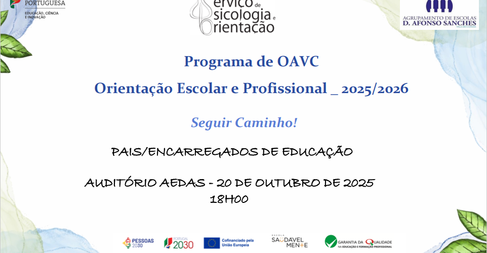No passado dia 20 de outubro de 2025, realizou-se no Auditório do Agrupamento de Escolas D. Afonso Sanches (AEDAS) a Sessão de Apresentação do Programa de Orientação Escolar e Profissional (OEP), dirigida aos pais e encarregados de educação dos alunos do 9.º ano.